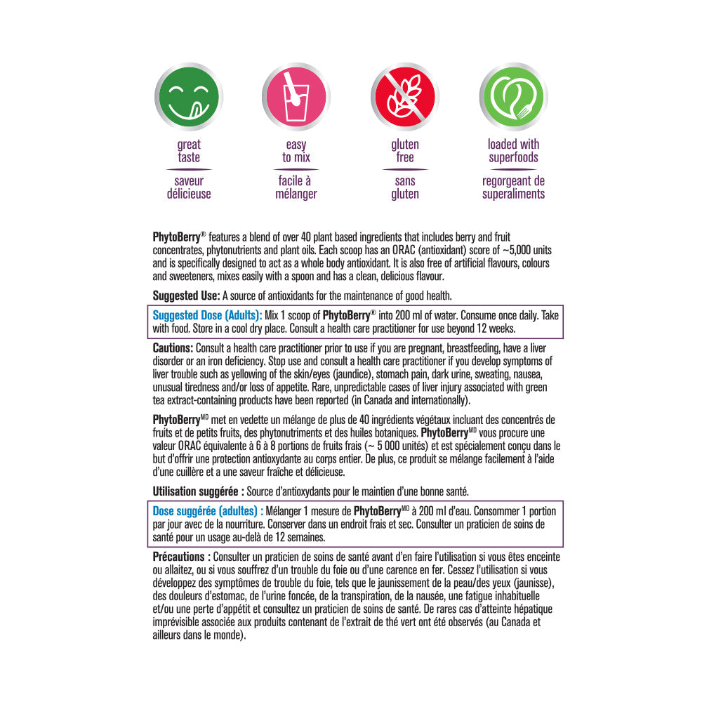PROGRESSIVE - PhytoBerry - 900 Gram(s) - NPN: 80036256 -- PhytoBerry is a highly concentrated berry based whole food supplement that is loaded with natural antioxidants. Featuring over 40 high ORAC value fruit concentrates, phytonutrients, essential fatty acids and herbal extracts, PhytoBerry is specifically designed to offer whole body antioxidant® protection. A single serving has the equivalent nutrient content of 6 to 8 servings of fresh fruit. Highly concentrated whole food supplement Over 40 ORAC rich food concentrates, phytonutrients and essential fatty acids ORAC score of ~5000 units Nutrient equivalent of 6 8 servings of fresh fruit Outstanding source of botanical nutrients Professionally formulated and energetically balanced