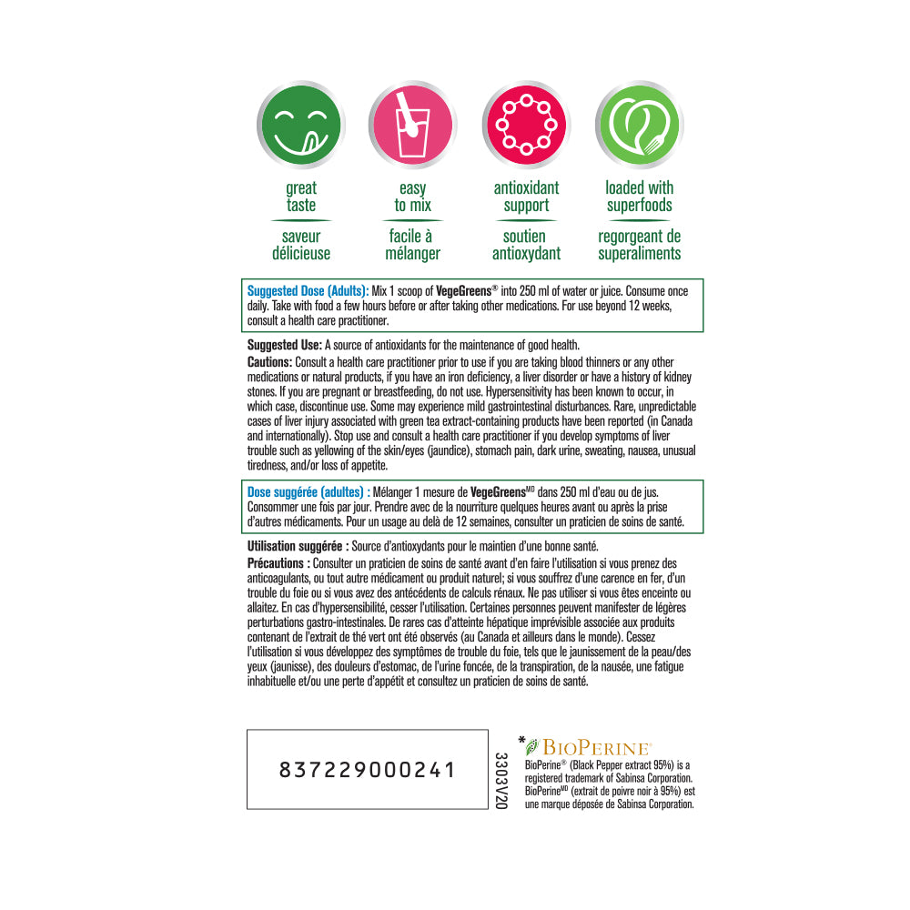PROGRESSIVE - VegeGreens - 265 Gram(s) - NPN: 80034973 -- The Ultimate Super FoodVegeGreens is a comprehensive combination of over 60 land, sea and cruciferous vegetables, as well as super green foods, plant oils, phytonutrients, herbs & extracts and botanicals. With 8 distinctive blends of green foods and plant extracts, VegeGreens supplies an extraordinary spectrum of nutrients ranging from the rare trace minerals found in sea vegetables to the health-enhancing compounds exclusive to cruciferous vegetables. Each small scoop provides the nutrient equivalent of 6 to 8 servings of fresh vegetables
