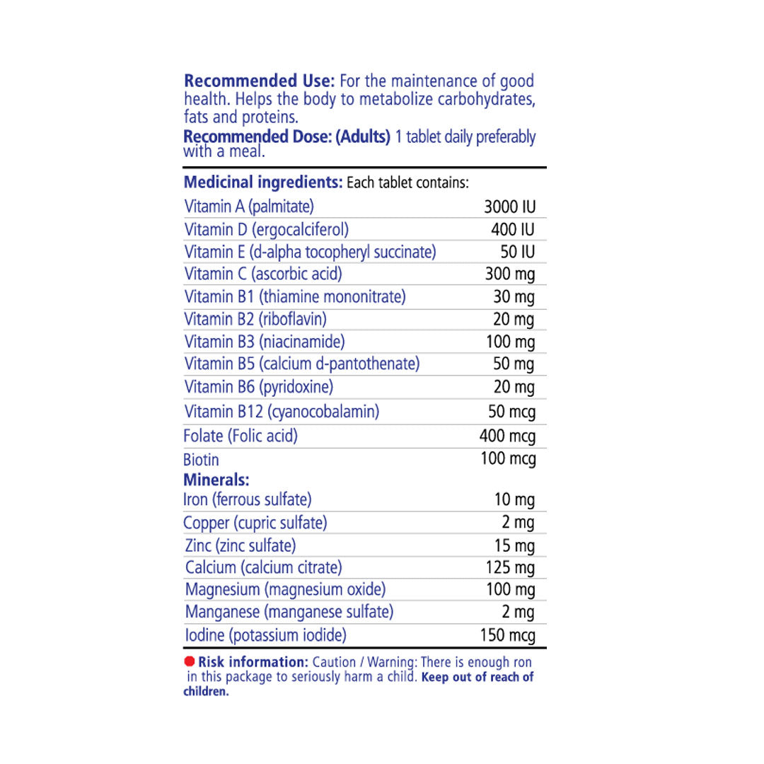 One‑a‑day multivitamin with 19 essential vitamins and minerals in each tablet.